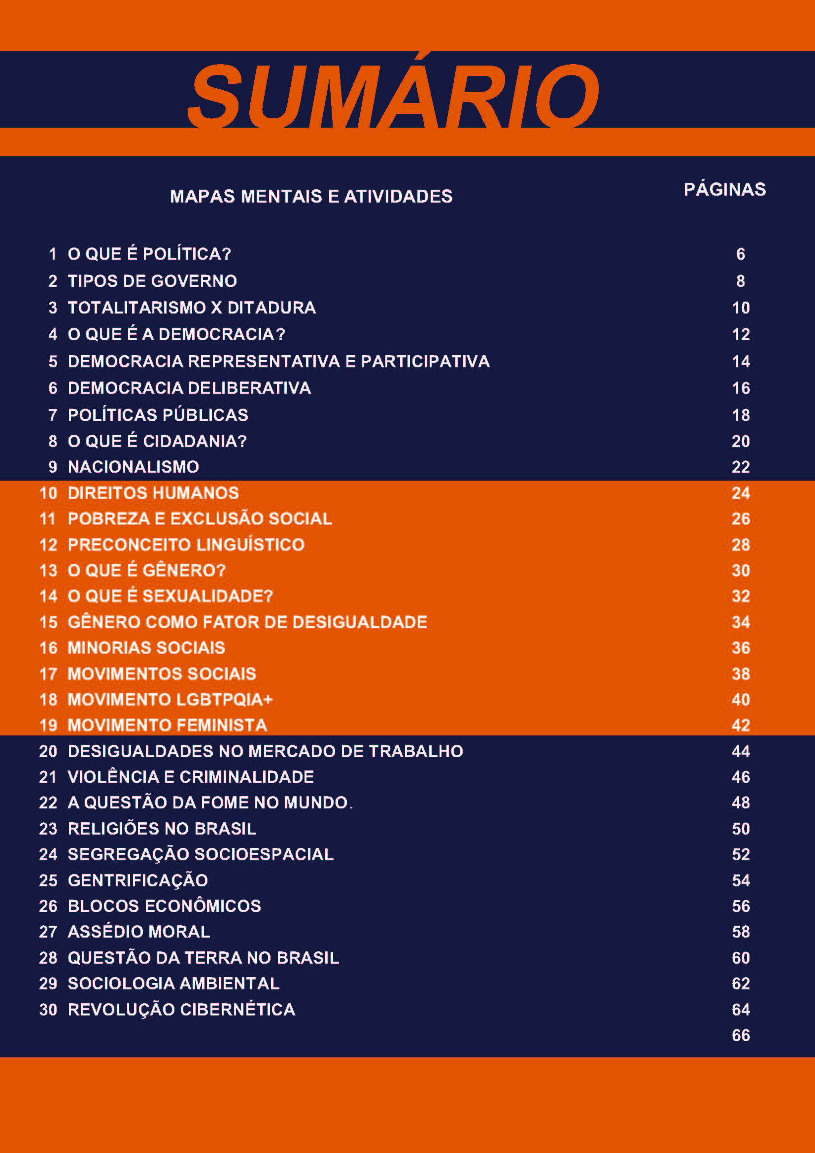 Este é o volume 3 da coleção de Sociologia para o Ensino Médio. Abordaremos todos os principais conteúdos do componente curricular. Nesta apostila você encontrará os seguintes temas: Política, Democracia, Cidadania, Gênero, Movimentos Sociais, Religiões, Sociologia ambiental, entre outros.