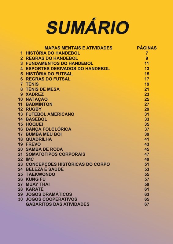 Esta unidade é o volume 3 da coleção de Educação Física para o Ensino Médio. Abordaremos todos os principais conteúdos do componente curricular. Nesta apostila você encontrará 60 páginas de atividades sobre os seguintes temas: Handebol, Futsal, Tênis, Futebol Americano, Beleza e Saúde, Danças, Lutas e Jogos.