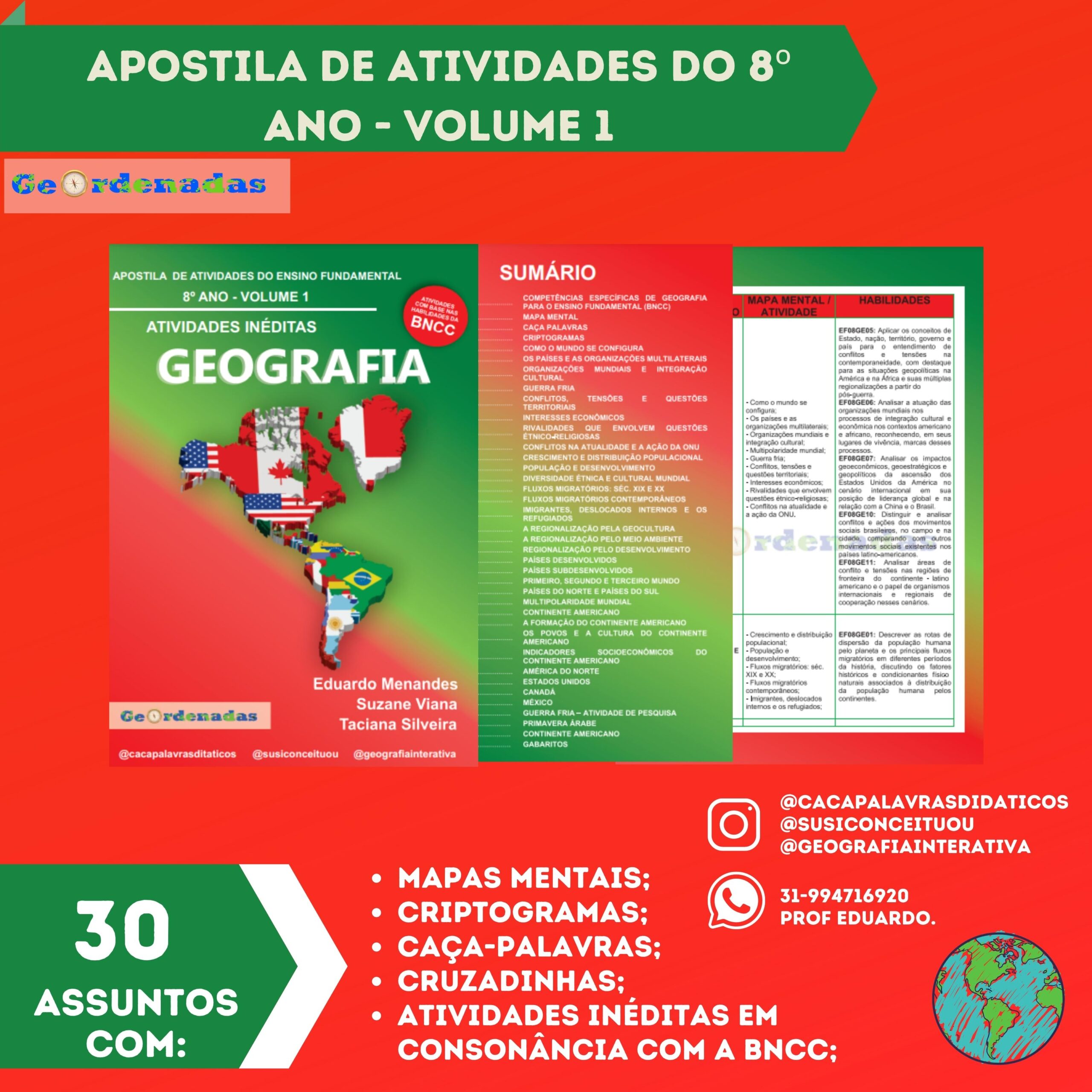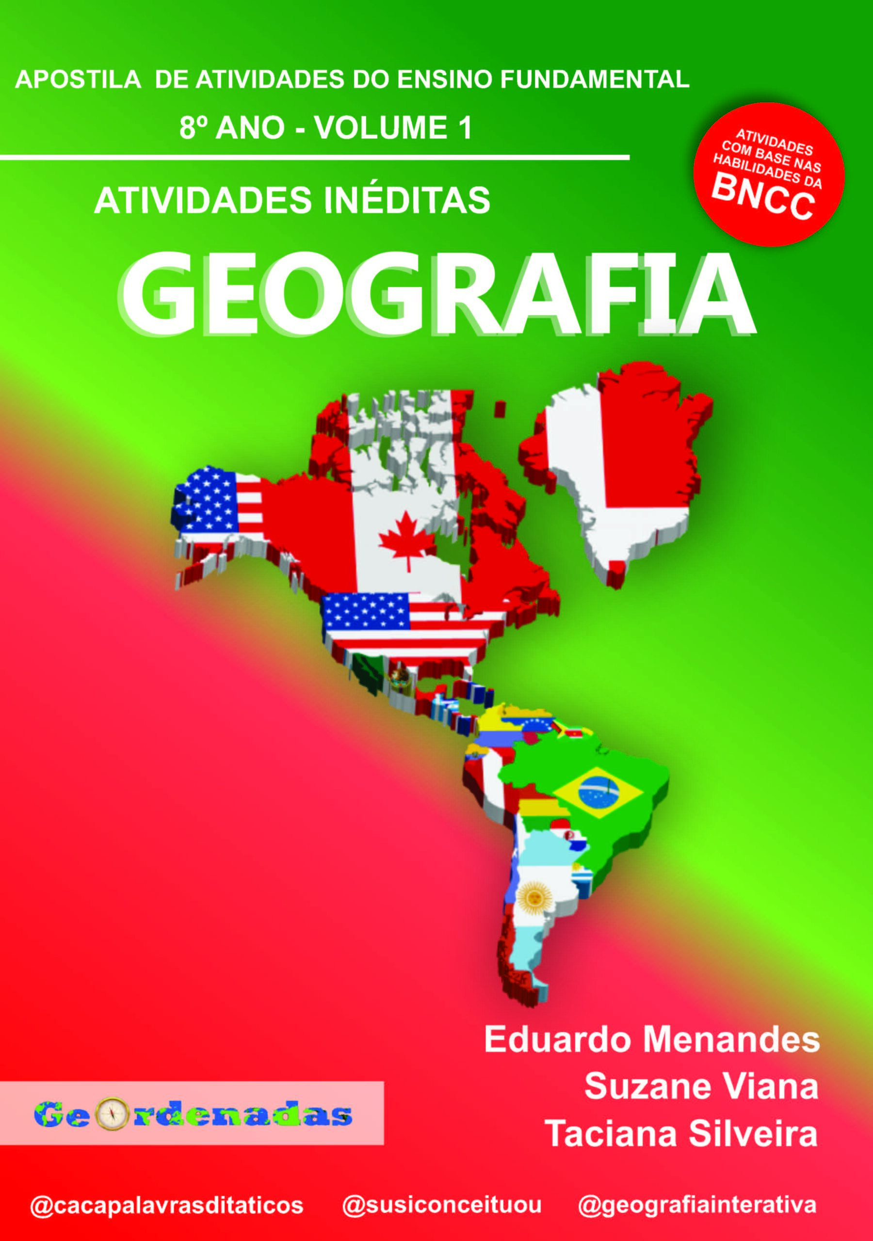 O projeto Geordenadas tem a honra de apresentar a Apostila de Atividades de Geografia, 8º ano – volume 1, para o Ensino Fundamental! A apostila do 8º ano é voltada para Professores e Estudantes que querem inovar no ensino-aprendizagem de Geografia e conta com 30 assuntos abordados através de: