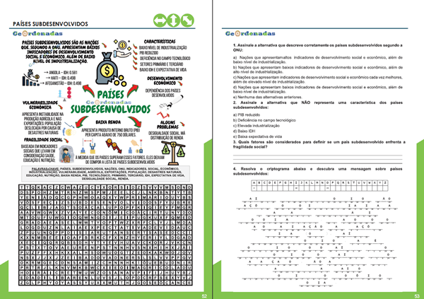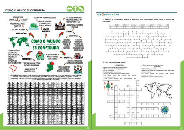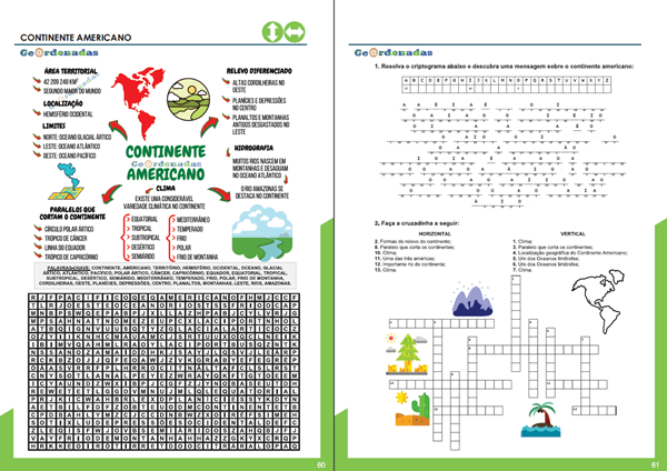 Nossas atividades são fruto de anos de pesquisa na técnica dos mapas mentais, caça-palavras e inteligências múltiplas. No início da apostila, você irá se deparar com uma tabela atualizada da BNCC, relacionando cada material a seu objeto de conhecimento e habilidades relacionadas. Logo em seguida, você conhecerá mais sobre as técnicas empregadas para desenvolver nosso projeto e poderá, enfim, ingressar no mundo Geordenadas, abordando novas formas de ensinar e aprender Geografia. Neste volume seu aluno irá desenvolver a habilidades referentes a inteligência espacial através de desenho e pinturas , o raciocínio a partir dos criptogramas e a inteligência linguística com base nos caça-palavras e cruzadinhas.