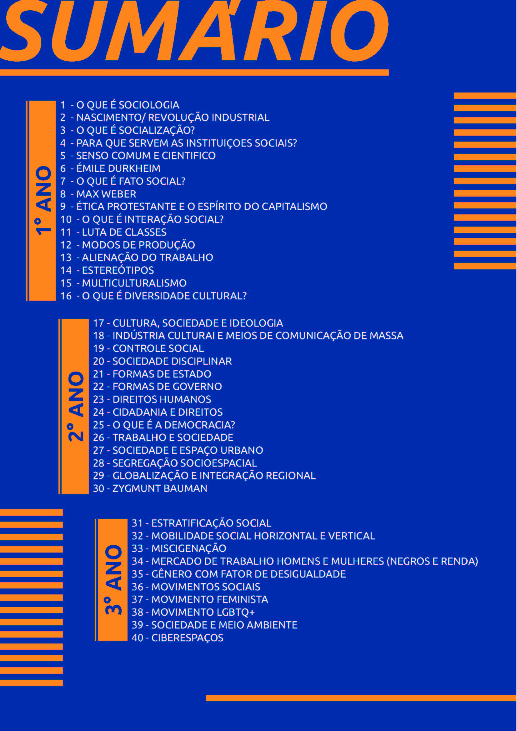 2º ANO: CULTURA, SOCIEDADE E IDEOLOGIA, INDÚSTRIA CULTURAL, CONTROLE SOCIAL, FORMAS DE ESTADO, FORMAS DE GOVERNO, DIREITOS HUMANOS, CIDADANIA E DIREITOS, TRABALHO E SOCIEDADE, SOCIEDADE E ESPAÇO URBANO, GLOBALIZAÇÃO E ESPAÇO URBANO .