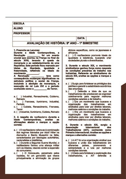 Esta apostila é referente ao 1º BIMESTRE de HISTÓRIA para o Ensino Fundamental 2 (9º ano). Este projeto contém 16 apostilas com atividades variadas. As atividades contém os códigos de Habilidades BNCC. Em cada uma das apostilas você encontrará: