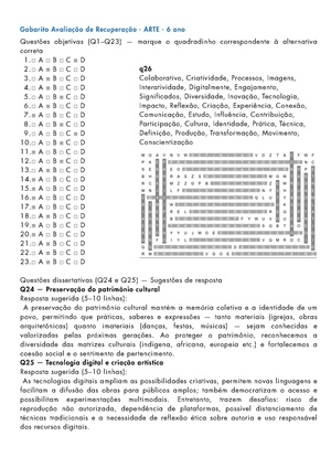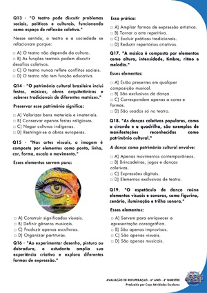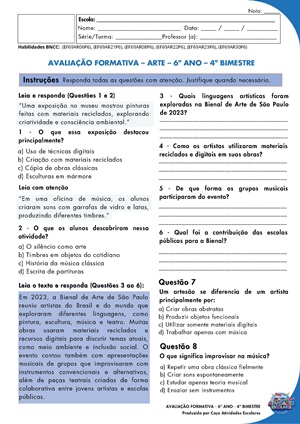 Esta apostila contém as avaliações e trabalhos de ARTE (PLANO DE CURSO DE MINAS GERAIS – 2025) para o 6º ano do Ensino Fundamental II, referente ao 4º bimestre.