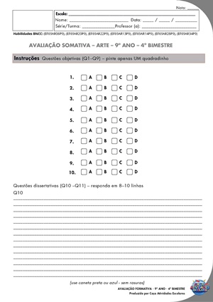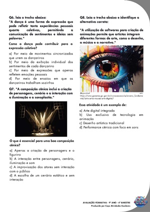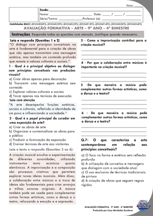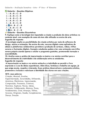 Esta apostila contém as avaliações e trabalhos de ARTE (PLANO DE CURSO DE MINAS GERAIS – 2025) para o 9º ano do Ensino Fundamental II, referente ao 4º bimestre.