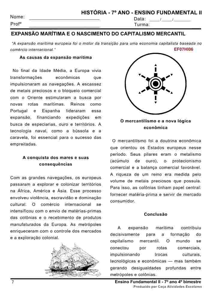 Esta apostila é referente ao 4º BIMESTRE, de acordo com o BASE NACIONAL COMUM CURRICULAR para o Componente curricular de HISTÓRIA para o Ensino Fundamental 2 (7º ano). Este projeto contém 16 apostilas com atividades variadas. As atividades contém os códigos de Habilidades BNCC. Em cada uma das apostilas você encontrará: