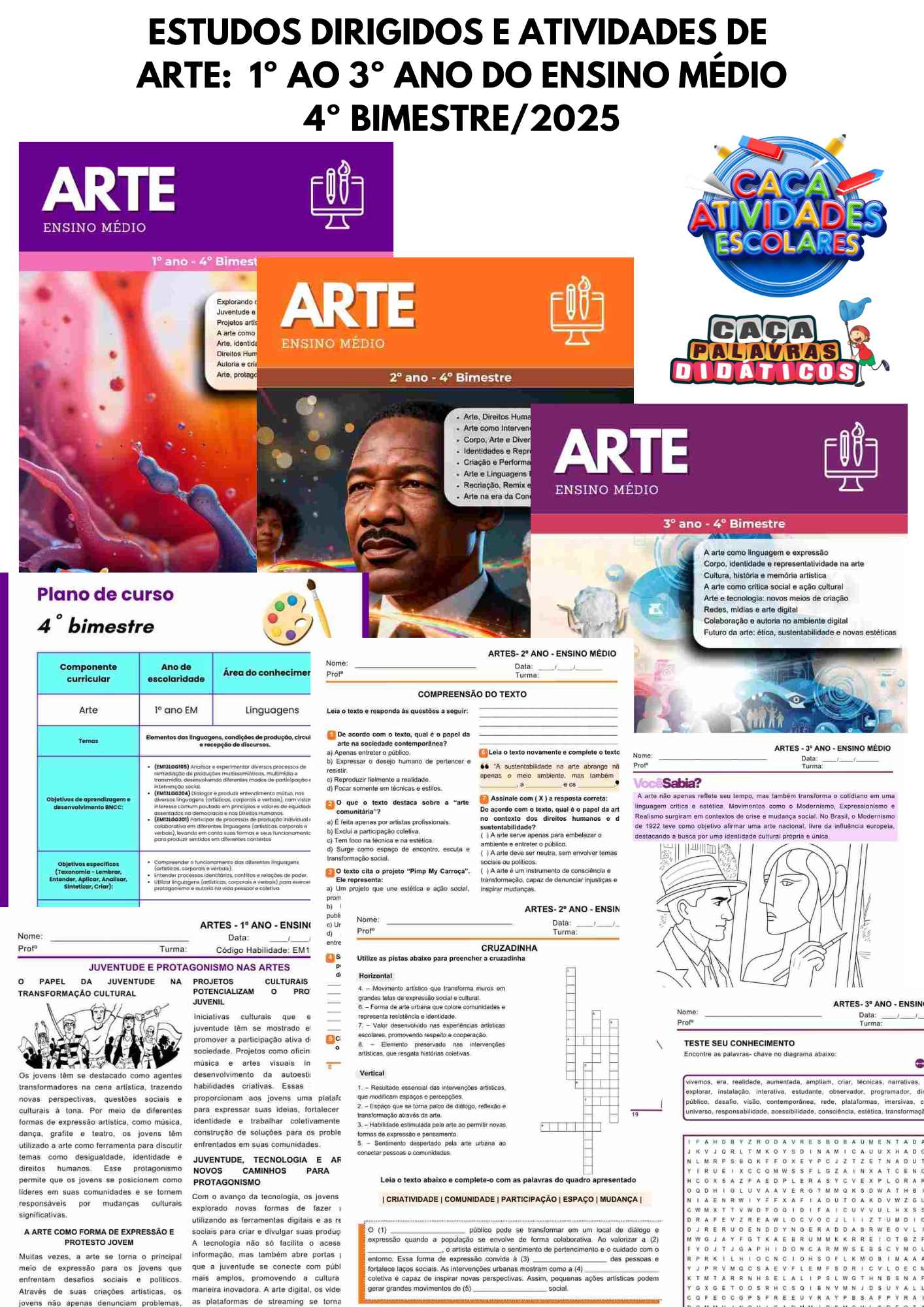 Esta apostila contém 3 apostilas de ESTUDOS DIRIGIDOS de ARTE (PLANO DE CURSO DE MINAS GERAIS – 2025) para o 1º ao 3º ano do Ensino Médio, referente ao 4º bimestre.