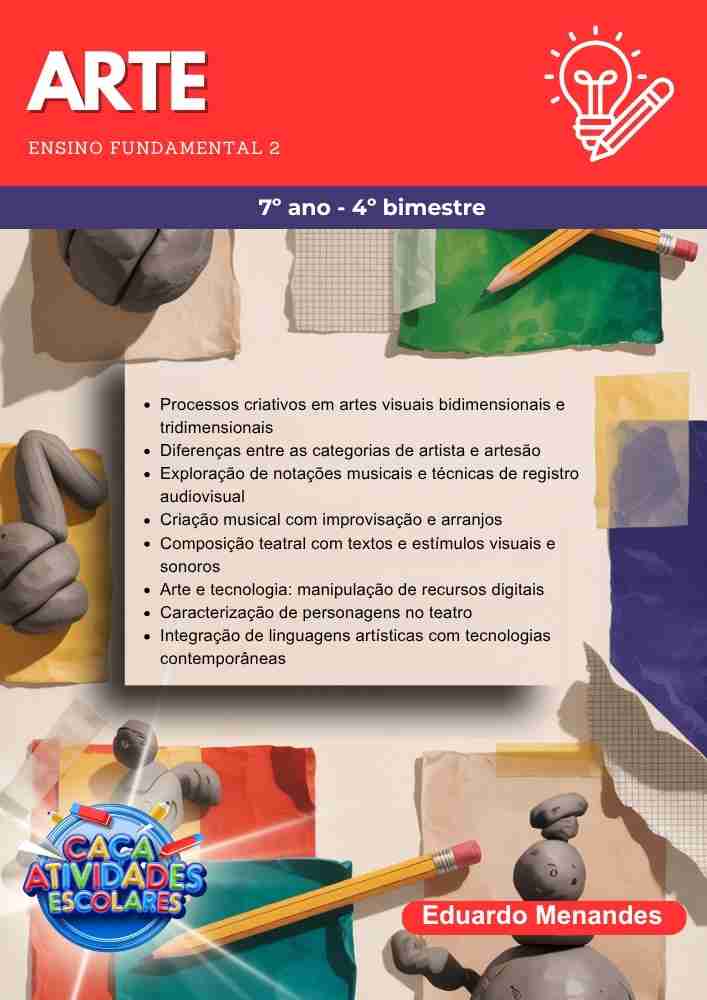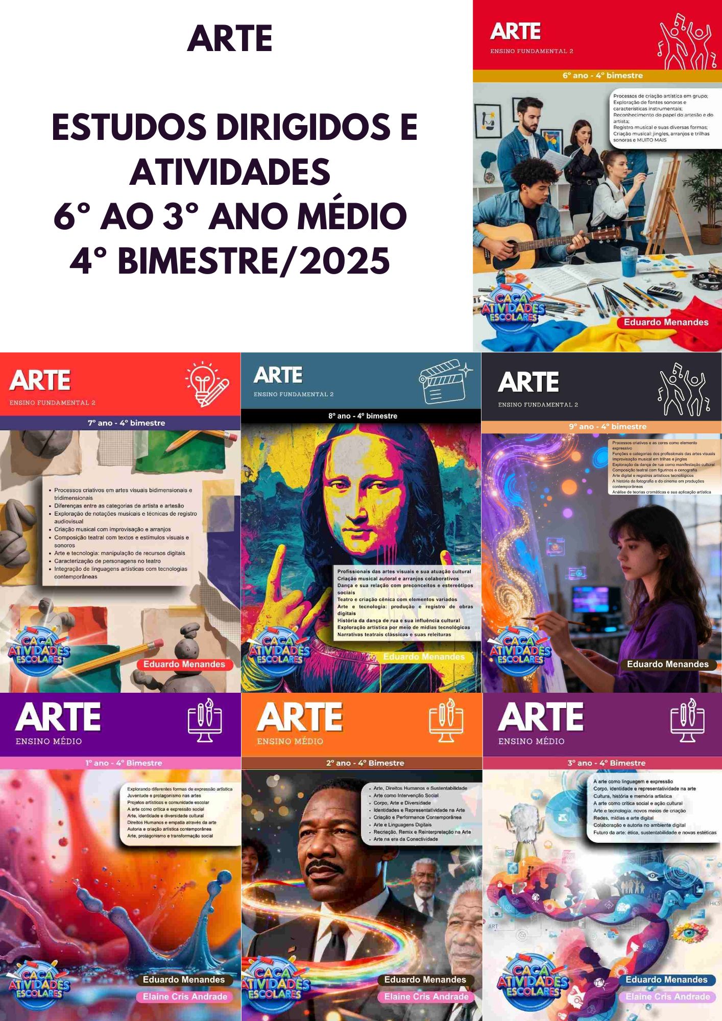Esta apostila contém 7 apostilas de ESTUDOS DIRIGIDOS de ARTE (PLANO DE CURSO DE MINAS GERAIS – 2025) para o 6º ao 3º ano do Ensino Fundamental 2 e Médio, referente ao 4º bimestre.