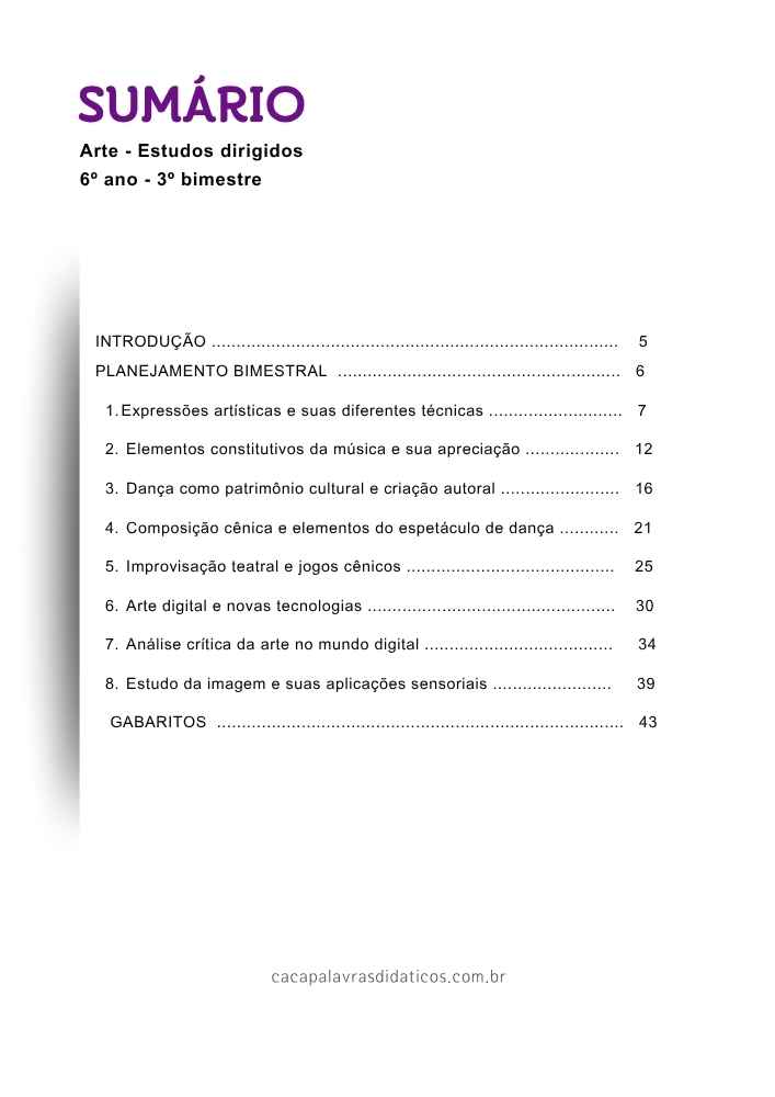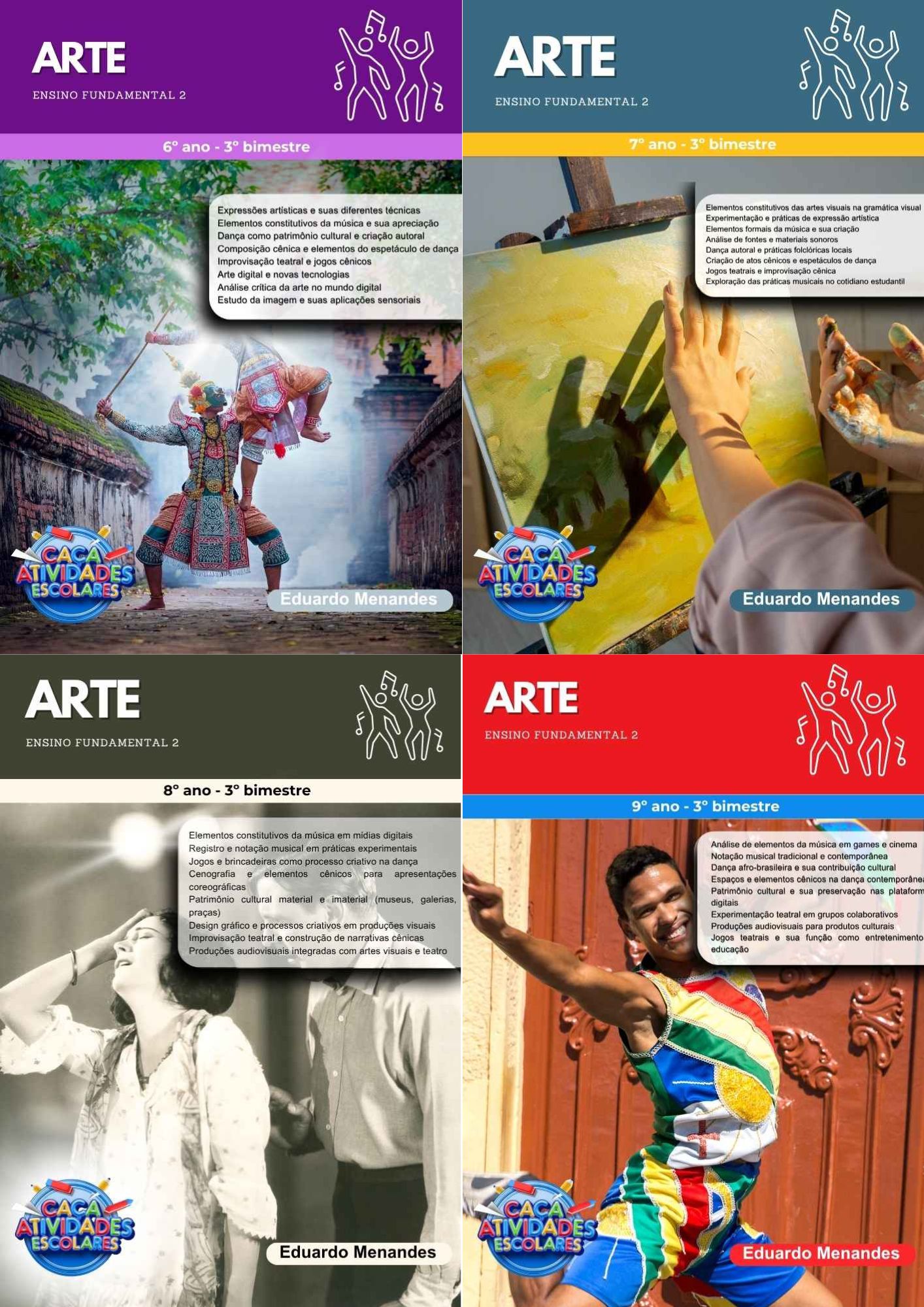 Este combo contém 4 apostilas de ESTUDOS DIRIGIDOS de ARTE (PLANO DE CURSO DE MINAS GERAIS – 2025) para o 6º ao 9º ano do Ensino Fundamental 2, referente ao 3º bimestre.