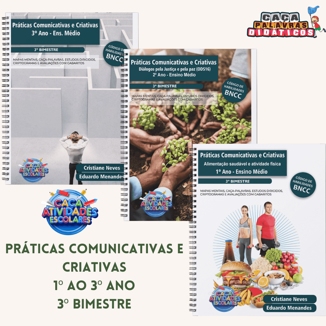 Este combo contém 3 apostilas com os temas referentes ao Itinerário Formativo de PRÁTICAS COMUNICATIVAS E CRIATIVAS – 3º BIMESTRE – PLANO DE CURSO DE MINAS GERAIS 2024.
