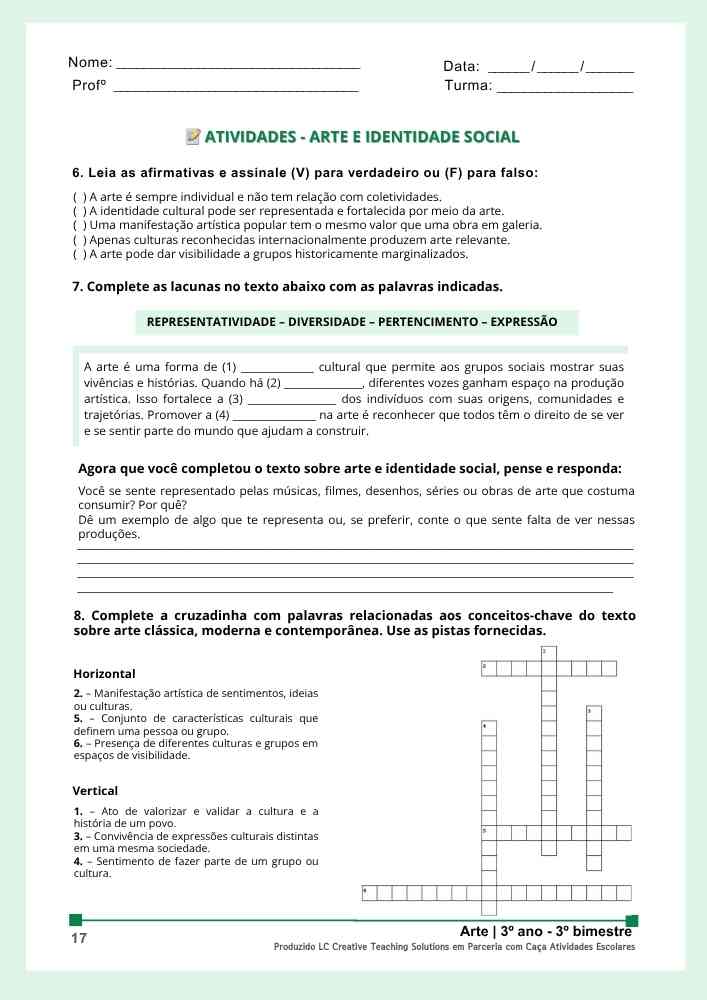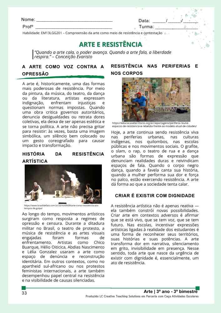 Esta apostila contém 8 ESTUDOS DIRIGIDOS de ARTE (PLANO DE CURSO DE MINAS GERAIS – 2025) para o 3º ano do Ensino Médio, referente ao 3º bimestre.