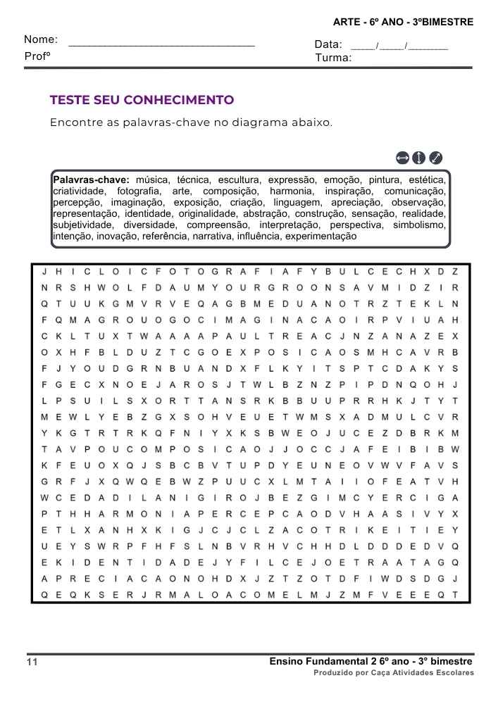 Esta apostila contém 8 ESTUDOS DIRIGIDOS de ARTE (PLANO DE CURSO DE MINAS GERAIS – 2025) para o 6º ano do Ensino Fundamental 2, referente ao 3º bimestre.