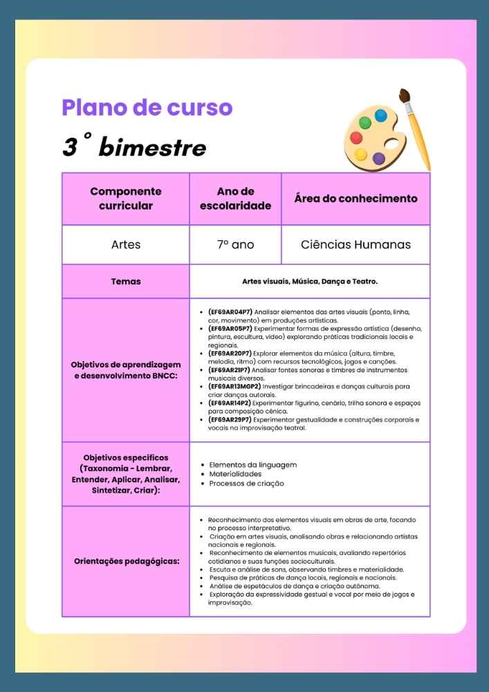 Esta apostila contém 8 ESTUDOS DIRIGIDOS de ARTE (PLANO DE CURSO DE MINAS GERAIS – 2025) para o 7º ano do Ensino Fundamental 2, referente ao 3º bimestre.