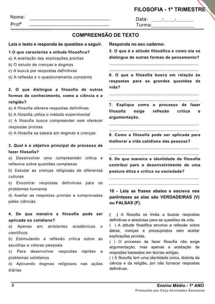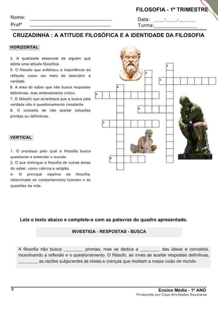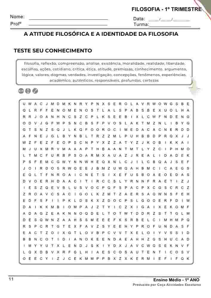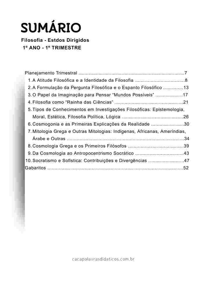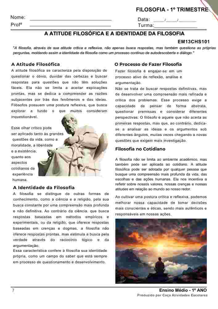 Esta apostila é referente ao 1º TRIMESTRE de FILOSOFIA para o Ensino Médio (1º ano). Este projeto terá 9 apostilas com atividades variadas. Em cada uma das apostilas você encontrará: