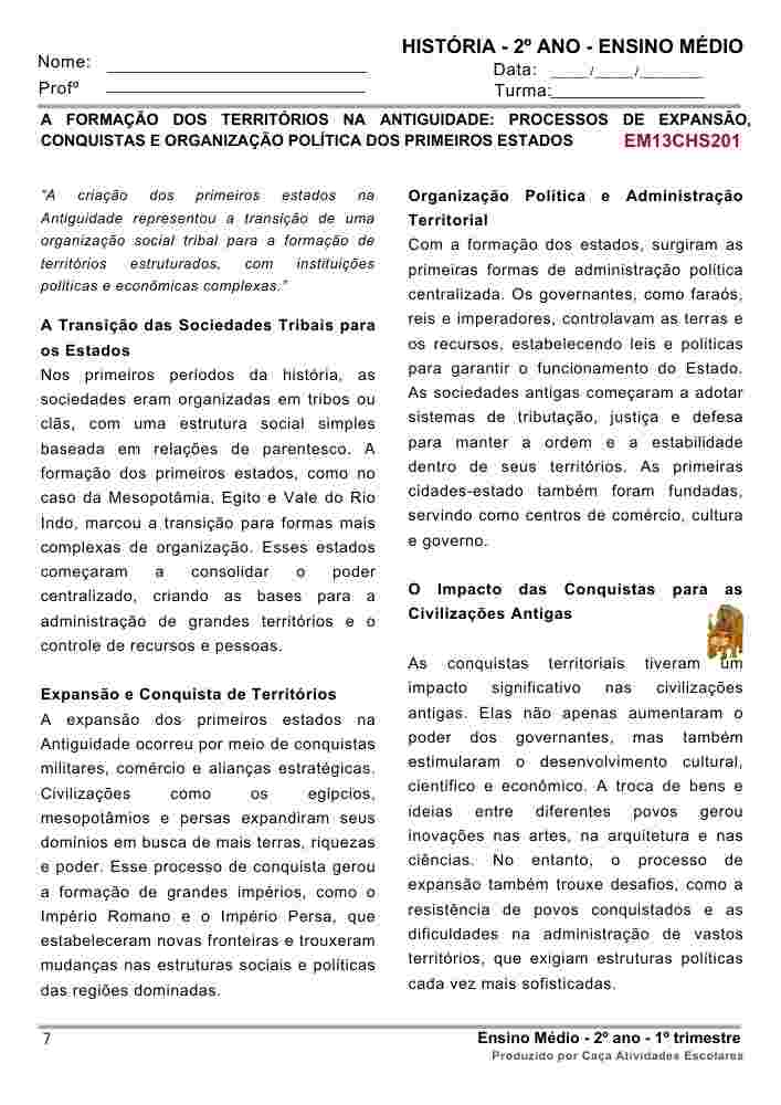 Esta apostila é referente ao 1º TRIMESTRE de HISTÓRIA para o Ensino Médio (2º ano). Este projeto terá 9 apostilas com atividades variadas. As atividades contém os códigos de Habilidades BNCC. Em cada uma das apostilas você encontrará: