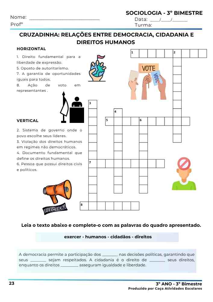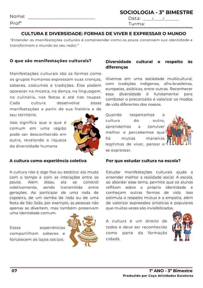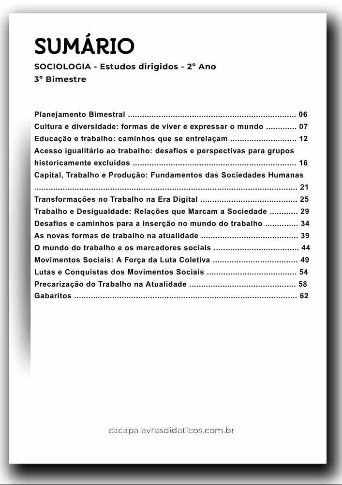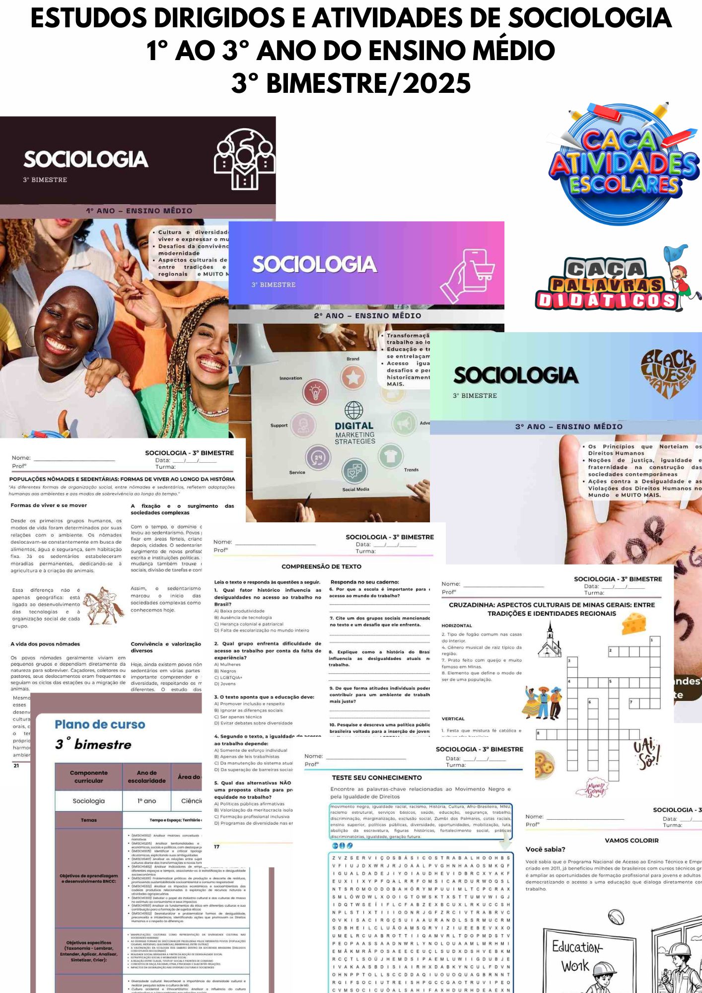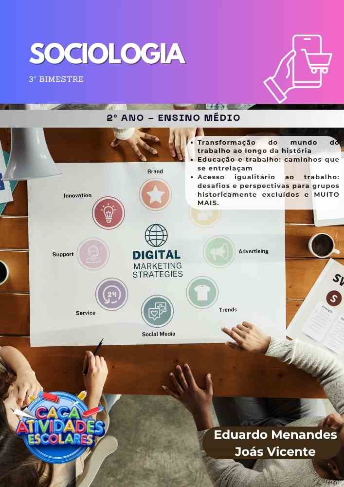 Esta combo contém 3 apostilas referentes ao 3º BIMESTRE de SOCIOLOGIA para o Ensino Médio (1º , 2º e 3º ano). Este projeto terá 12 apostilas com atividades variadas. Em cada uma das apostilas você encontrará: