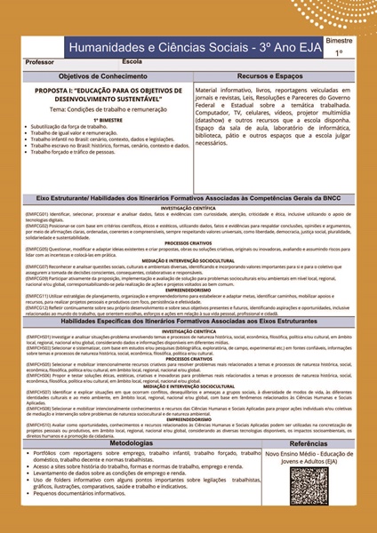 HUMANIDADES E CIÊNCIAS SOCIAIS – 3º ANO EJA: 1º BIMESTRE – PLANO DE CURSO DE MINAS GERAIS 2024: PROPOSTA 1