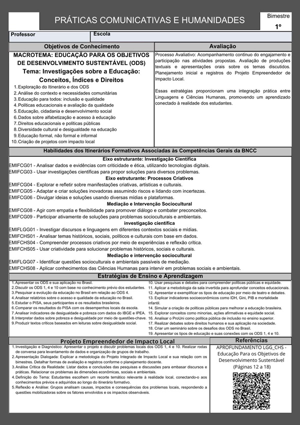 PRÁTICAS COMUNICATIVAS E HUMANIDADES – 3º ANO – ENSINO MÉDIO: 1º BIMESTRE – PLANO DE CURSO DE MINAS GERAIS 2025